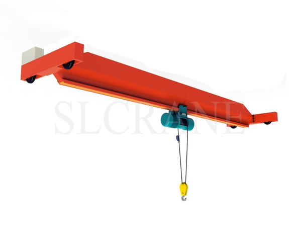 Single main girder supporting the hoist. Simple structure, low cost. Capacity up to 32 tons, span up to 30 meters. Suitable for light to medium loads in small workshops.