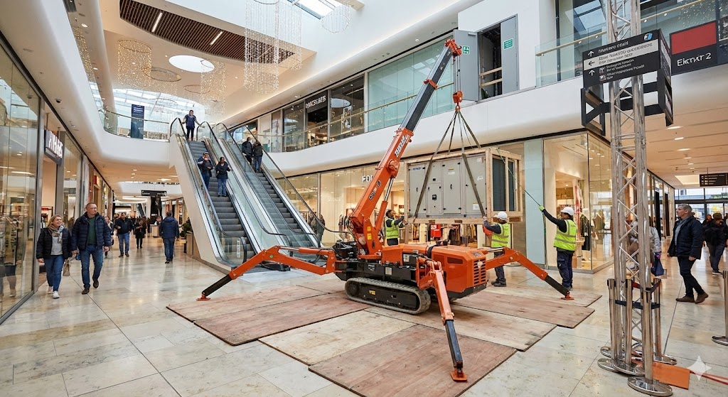 The multi-legged outrigger system lets us set the crane up in irregular spaces: one leg extended further into a corridor, one tucked in near a column, and so on. In many malls, this is literally the only way to get a serious lifting tool close to the final position.