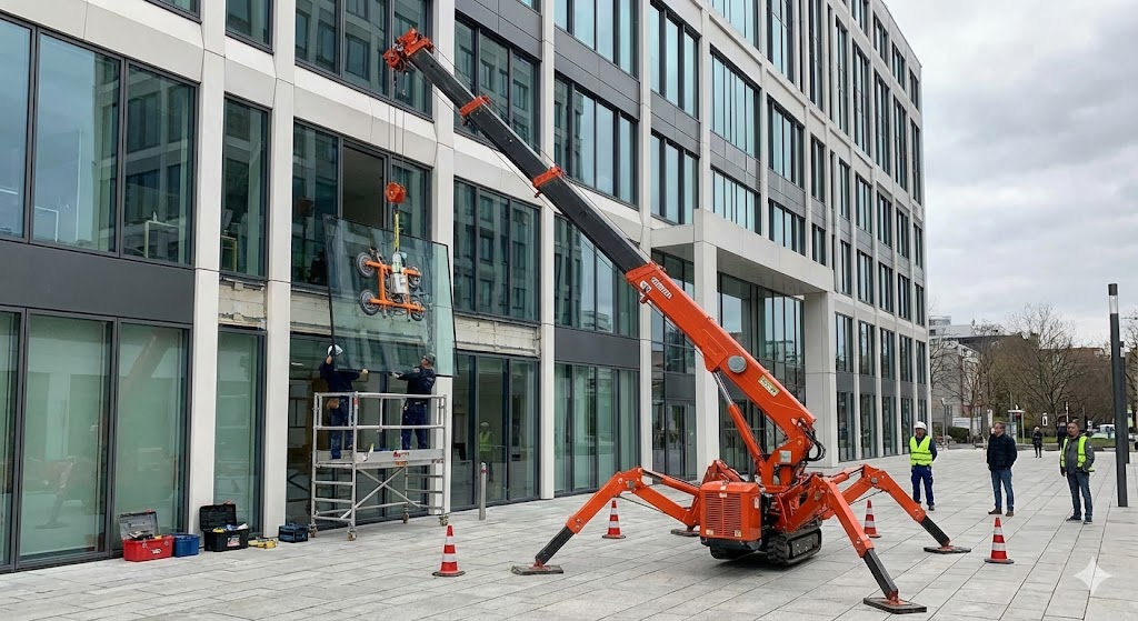 From my own experience, the real value of the spider crane here is precision without shock. When we install a heavy glass panel at height, the last 100–200 mm of movement matter more than the first 10 meters. If the crane can move the load millimetre by millimetre, without jerks, the risk of damage drops dramatically.